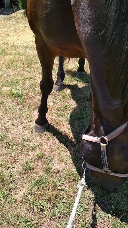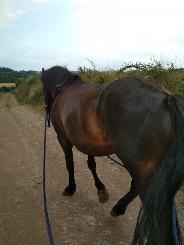 Et certains jours, nous agrémentons cette sortie minimaliste de travail à pied (s'arreter, reculer, chasser les hanches, et prochainement les épaules), de longe (il bloque à droite car il n'a vraisemblablement jamais été travaillé de ce côté) et de promenade en main/monté seul/avec des copains. L'objectif est qu'il m'associe à une sortie positive.