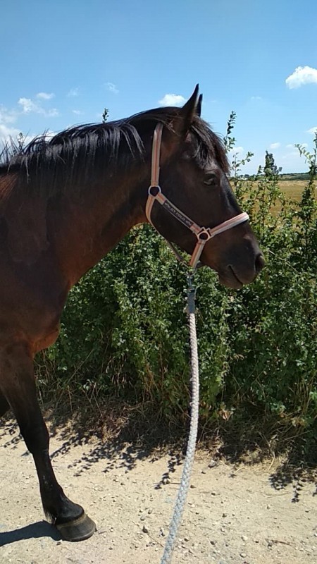 Avant d'arriver à la maison, il a vécu 6 ans au pré à se faire cajoler... Un peu trop, du coup il ne connait pas bien les limites avec l'homme. Il a été monté quelques fois, il a du faire 2-3 balades et des changements de pré à cru en licol, mais n'a pas eu un travail "classique".