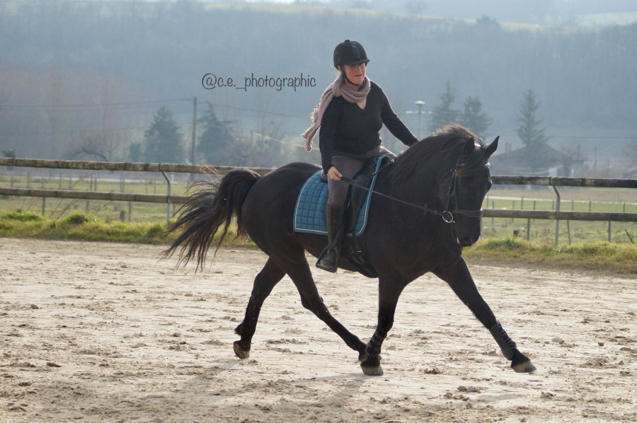 On refera une séance de travail sur le plat le lendemain matin. La dure séance de la veille aura porté ses fruits! Dino se tient beaucoup mieux, plus fixe, moins de "discussion". Après une détente pas/trot en autonomie où Dino est relativement bien, on reprend le travail galop-trot-galop sur le cercle. Mais alors il m'a sorti tous les départs au galop fantaisistes possibles!