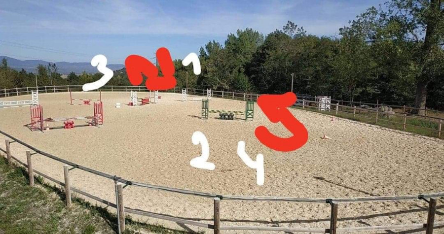 On commence par assouplir la bete avec au galop volte hanches en dedans volte epaule en dedans. Je ne tiens pas assez Dino sur ma rene extérieure dans la volte, ce qui fait qu'on manque d'équilibre pour la suite.