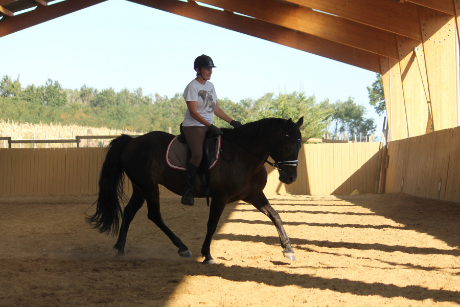 Cercle en A et C au galop, allongement sur la longueur (OMG Dino rentre moi ce cul completement traversé! Elle a eu du mal à oser demander un allongement)