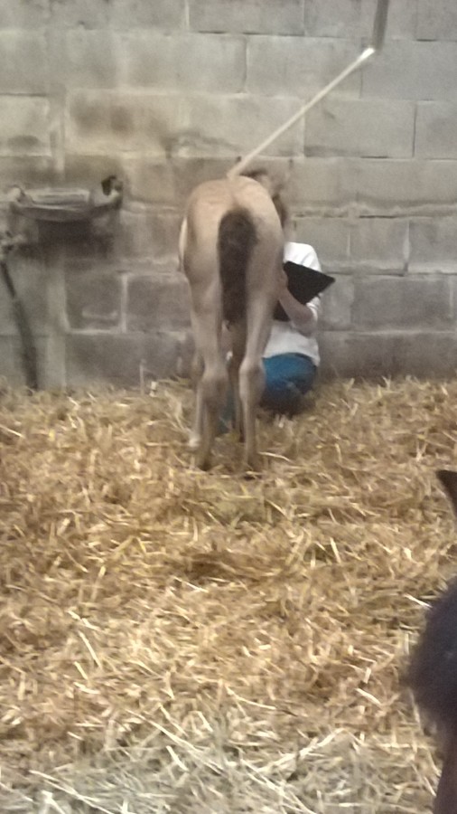 Le papa de Falcone est champagne Classic donc noir avec un gêne champagne. Sa mere est pie tobiano bai. Il a donc pris le tobiano bai de sa mere et le gêne champagne de son père