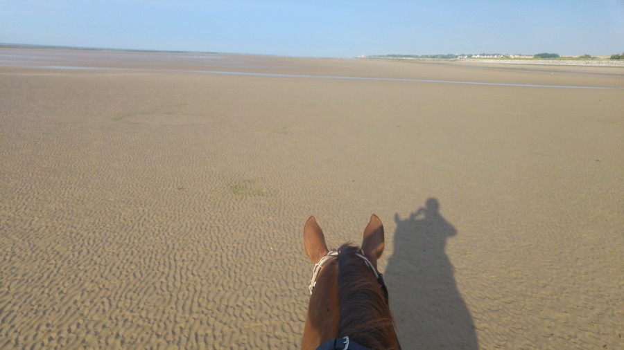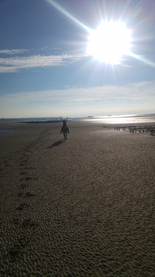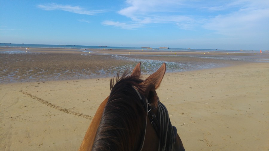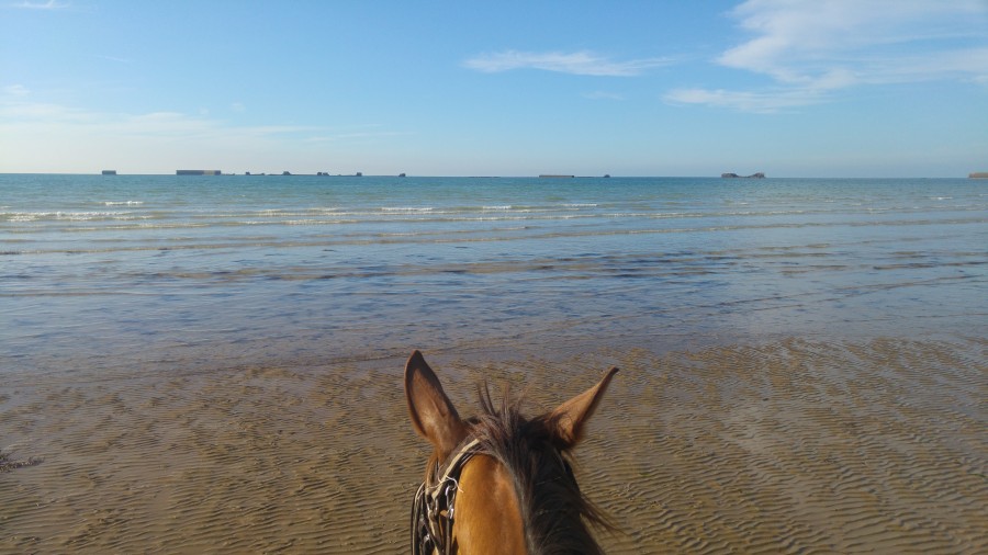 Banjo a pris une petite leçon d'histoire à galoper sur les plages du Débarquement, avec le port artificiel d'Arromanches en face de lui..