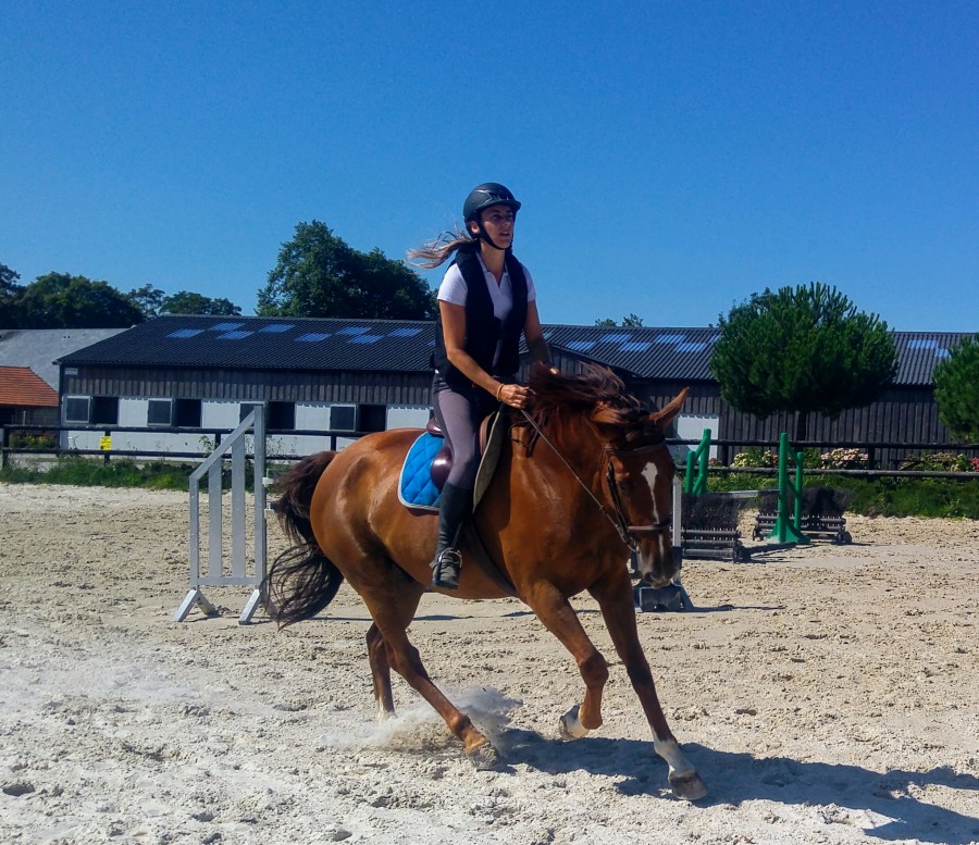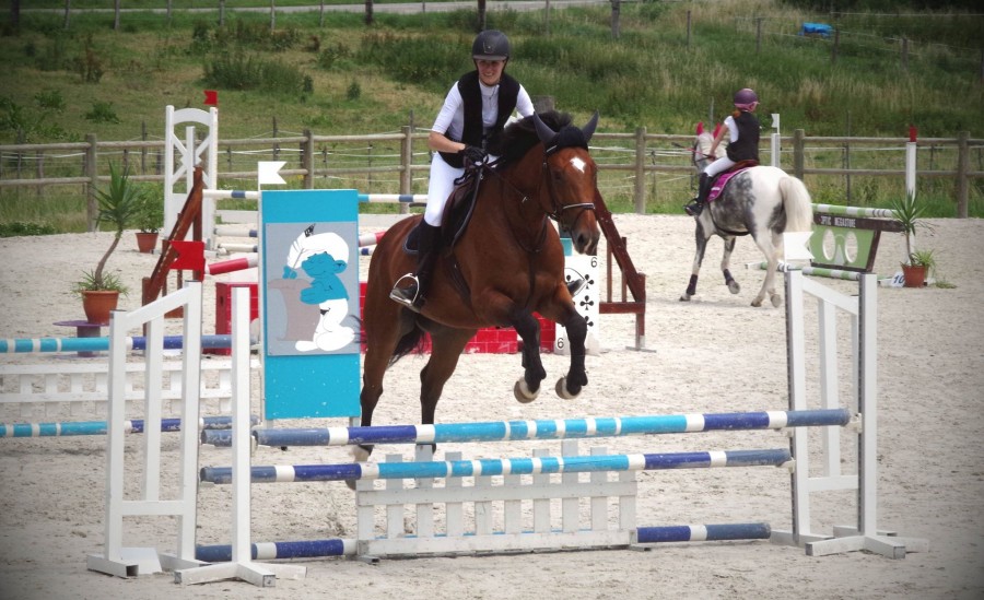 Je me suis forcée à penser à m'asseoir et à attendre le saut aux abords + à garder mes rênes bien tendues, du coup Banjo m'attendait et on était synchro ! Pas de georgette à la con où je pars avant lui et il refait un pied..