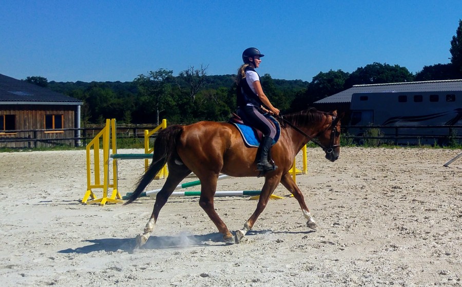 On a commencé par retravailler les changements de pied au galop sur une barre au sol, là par contre c'est moi qui merde, j'y arrive pas. Bon, Banjo n'y mets pas non du sien : il s'en fout de la barre au sol et ne s'en sers pas du tout pour changer de pied, il change éventuellement après mais j'ai pas réussi à lui faire passer les postérieurs.