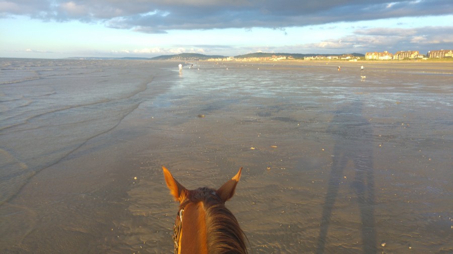 Ensuite je suis partie en vacances, j'ai demandé à un bon cavalier de le bosser uniquement sur le plat 2 à 3 fois la semaine, histoire qu' il s'encroûte pas trop non plus. Bon, au final, vu l'état des paddocks avec la canicule, ya rien à brouter donc Banjo est resté fit !