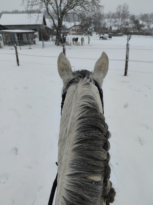 Chui montée 20 minutes ... Zouzou tordait l'encolure, vrillait la nuque etc pour éviter la neige, bref pas top !