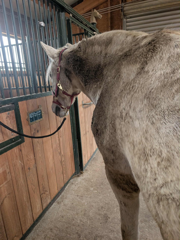 Retour aux écuries place aux soins avec couverture céramique, soins des pieds, tresses puis petit massage et travail du sourire au clicker