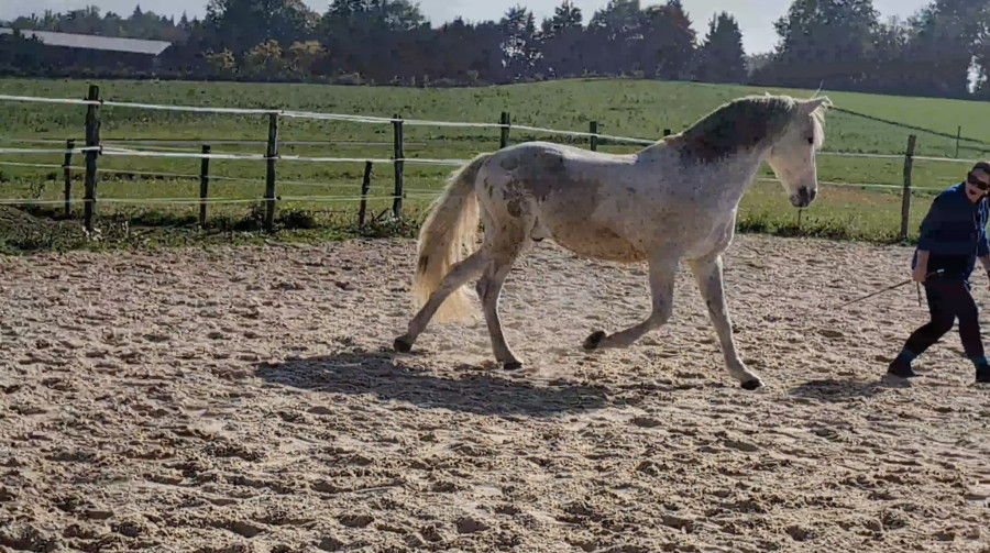 Bon à un moment sur un cercle au galop en passant le long du grillage y'a les oies qui lui ont braillé dessus oups il a pas aimé il est parti plein c*l galop coup de cul pendant un moment oups !