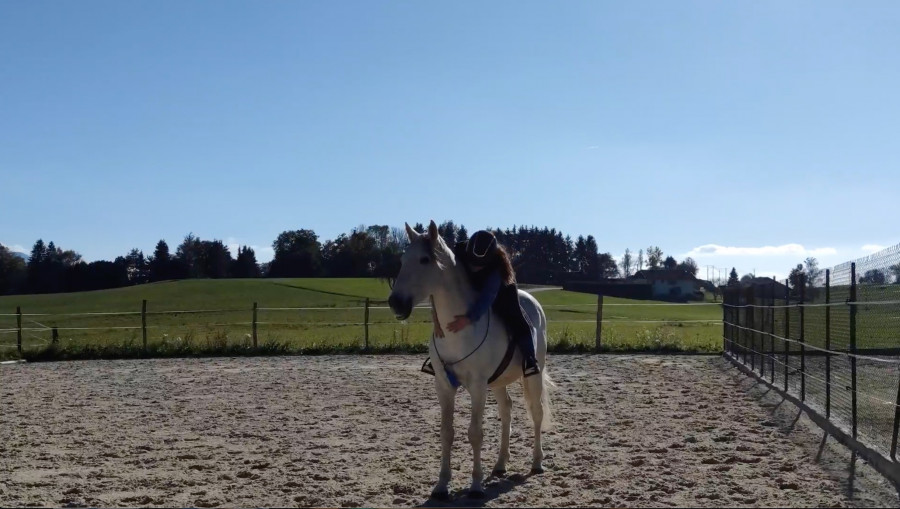 On commence par détendre en licol en essayant d'agir le moins possible dessus, transitions à l'assiette et la respiration, les tournants à l'assiette et juste rêne d'appui, super poney extra !