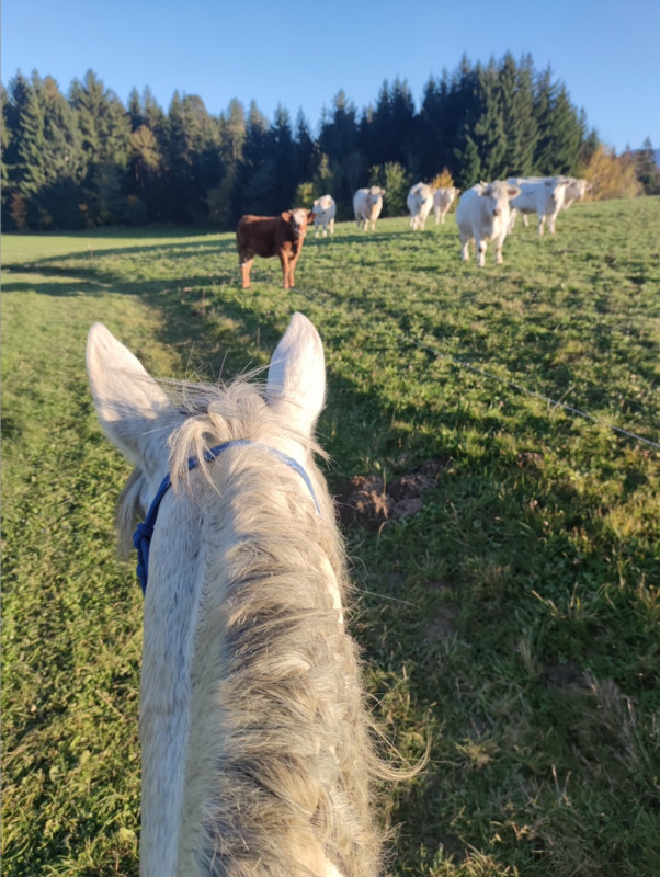 Petit moment drôle, on passe le long de vaches et la marron nous a suivi tout le long du chemin au "galop coup de cul" (je sais pas si ça se dit pour une vache ), elle était trop a fond mais Zaïro au pas tranquille rien a faire super poney