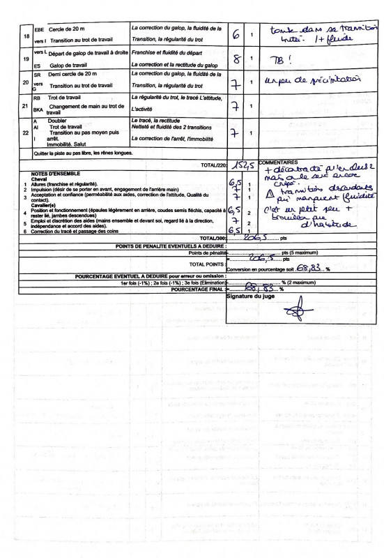 J'avoue que sur les notes, il y a quelques petites choses qui me chagrinent. J'ai notamment du mal avec le 6 sur le pas allongé alors qu'il trottine. Pour moi, ce genre de faute est immédiatement puni d'un 4 au plus. Je trouve du coup la notation un peu trop "homogène", il n'y a pas assez d'écart entre le vraiment bien et le vraiment raté. L'objectif d'un jugement, c'est aussi de savoir ce qui a péché et qui mérite du travail. Là en lissant l'ensemble, ça ne saute pas aux yeux (sur le protocole).