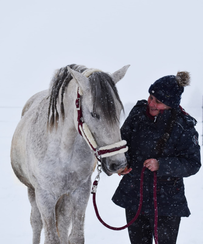 Ce licol bordeaux lui va à ravir et ressort bien sur la neige!