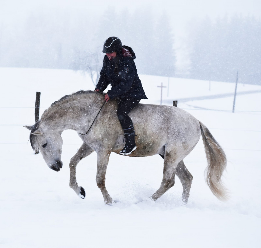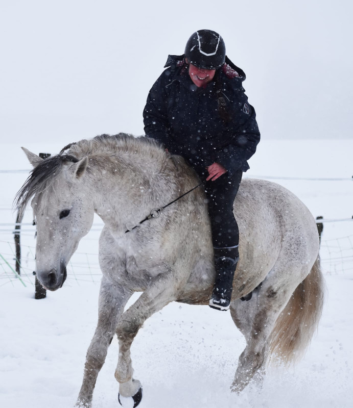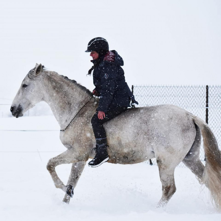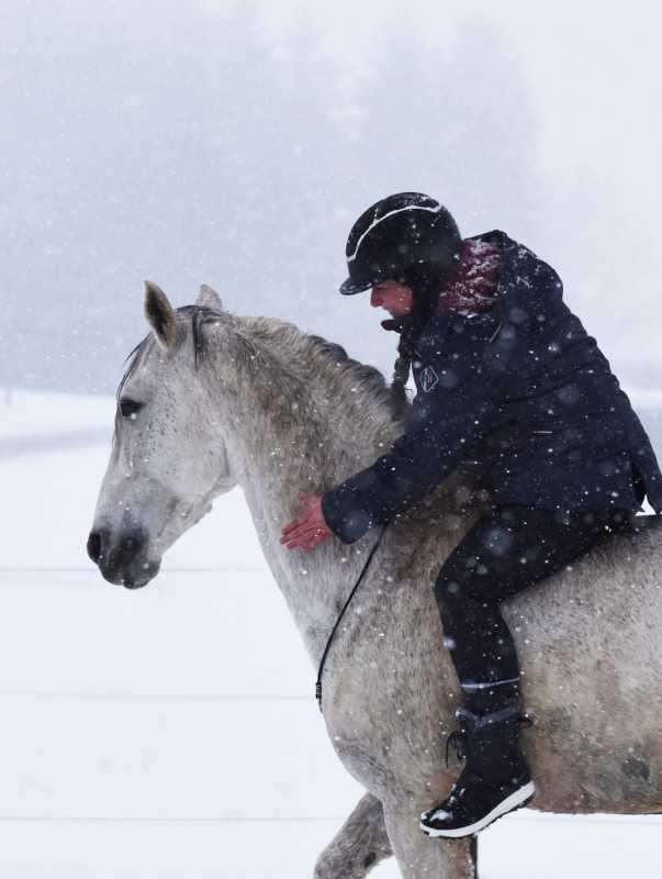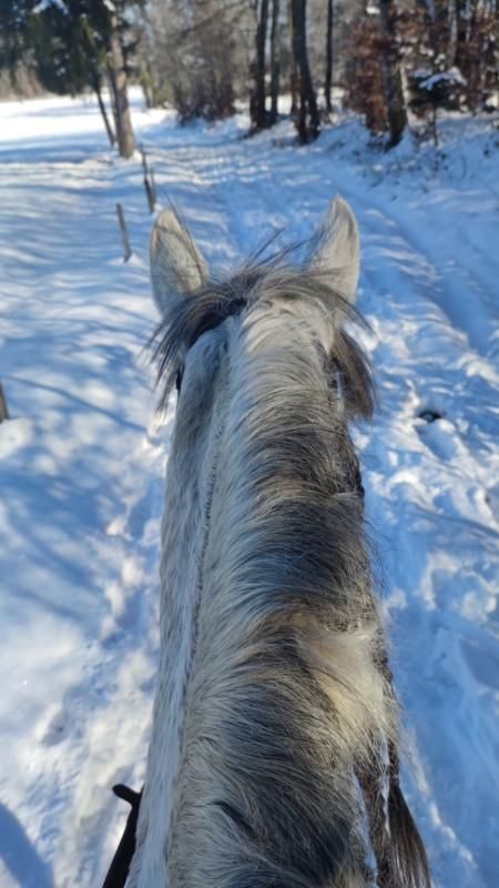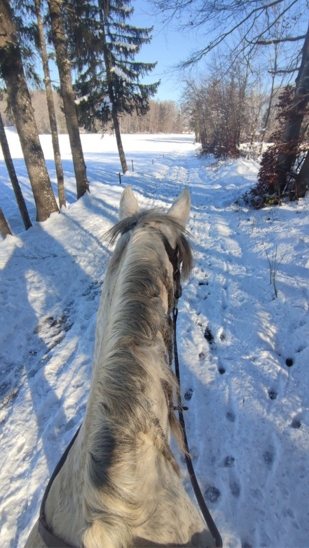 Donc petit tour de 40 minutes ! Les chemins sont dégeulasses mais les champs sont blindés de neige et pas gelés donc on a pu se faire plein de galop, trop le kiff et puis alors poney super sage, extra, trop top