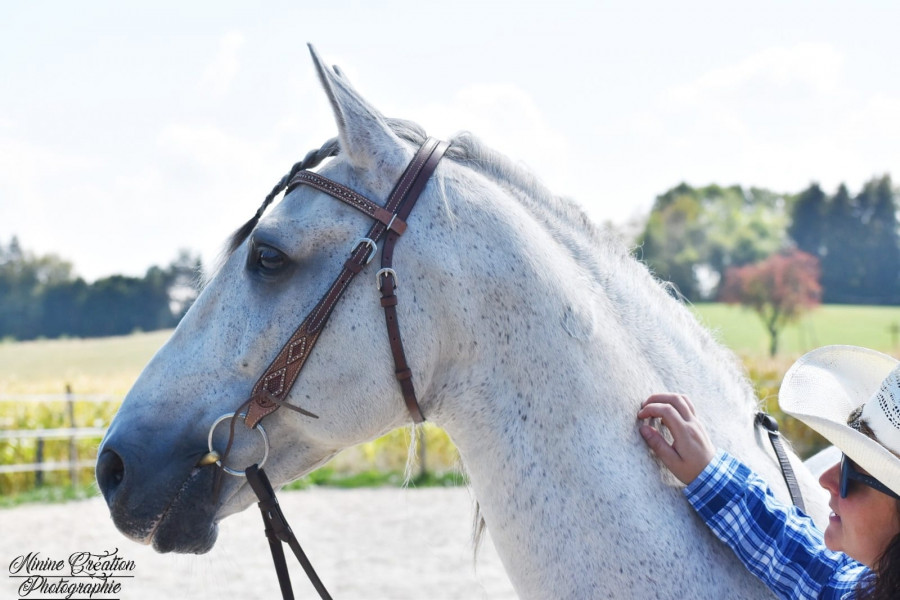 Je commence par brosser et faire connaissance avec la demoiselle, on selle, on bride (enfin d'ailleurs elle est montée en sans mors) et direction le manège !