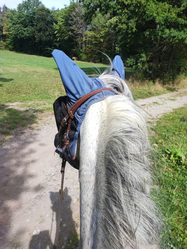 Par contre à un moment on s'est séparés pour qu'elle teste la jument toute seule, oulala panique à bord de monsieur Zouzou qui appelait, se retournait etc pauvre chaton ! Donc beaucoup de caresses, rênes longues au pas tranquille etc pour le rassurer puis c'est passé !