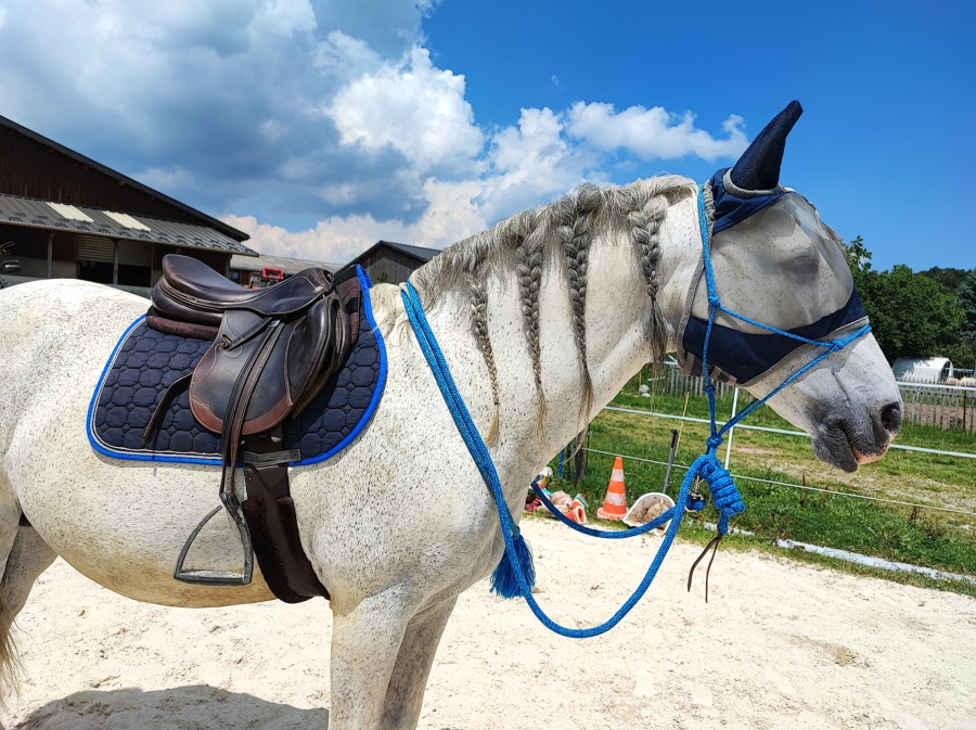 Pansage, soin des crins, câlins gratouilles et quelques exos dans les écuries en R+ au clicker ; sourire et croiser les antérieurs !