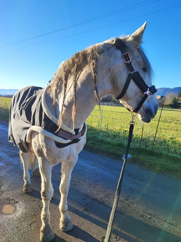 En mars de l'année dernière je trouve une nouvelle DP, une jument trotteuse de euh on m'avait dit 14 ans mais à priori plutôt 17 d'après mes recherches, qui a été réformée, n'a pas couru mais a fait les entrainements, puis a fait 6 poulains puis remise en pré et jamais vraiment bossée.
