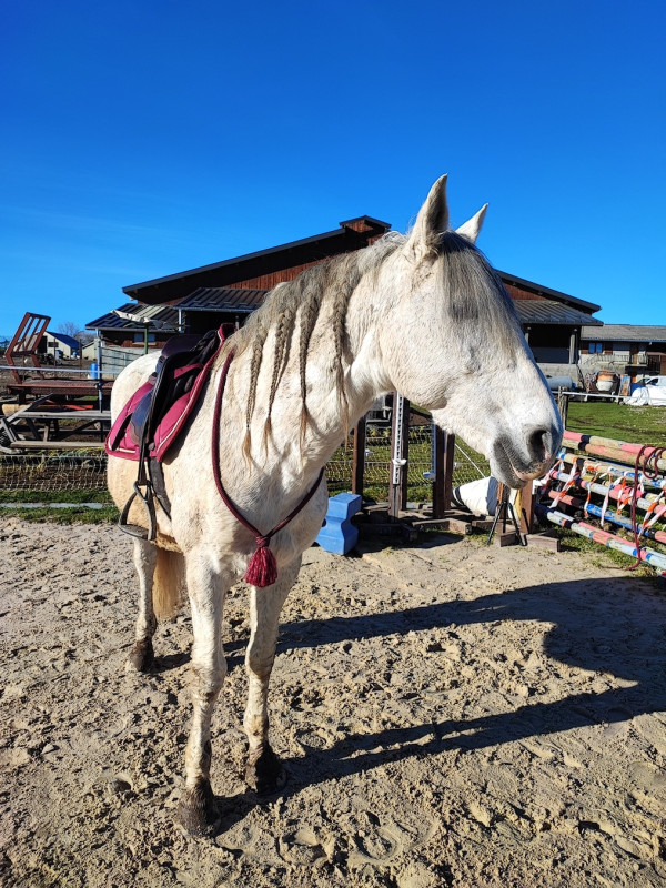 2015 je pars du club et je prends une DP sur une grande ponette pour CSO. Après notre premier concours, jument boiteuse, verdict arthrose, elle ne pourra plus jamais sauter. Bon, des mois de réeducation, je retrouve les plaisirs de monter à cheval juste pour le plaisir, pas pour la compet, et surtout loin des barres.