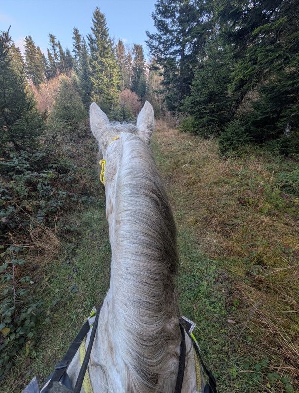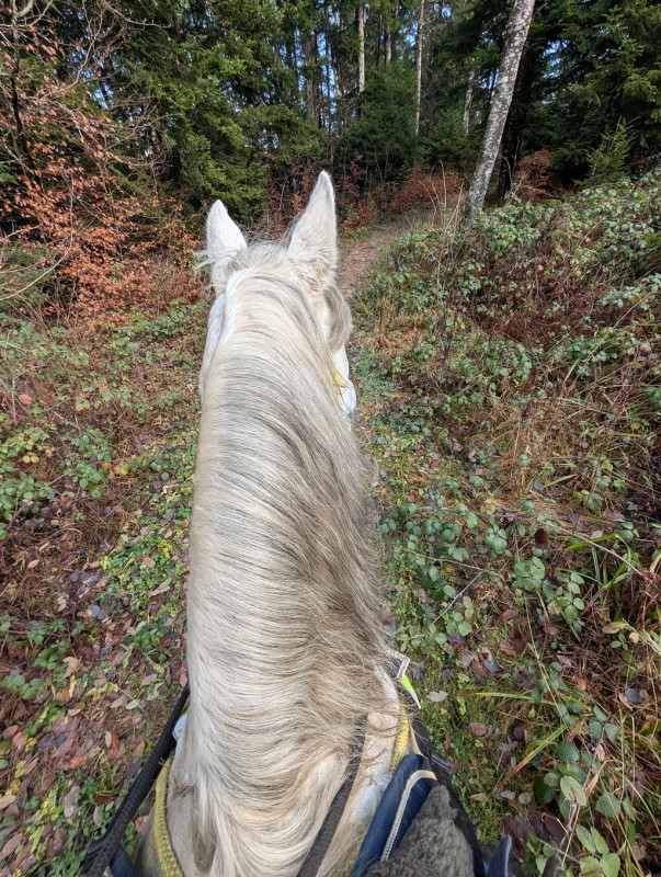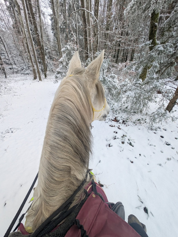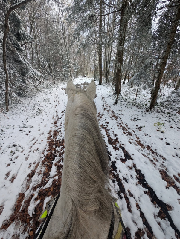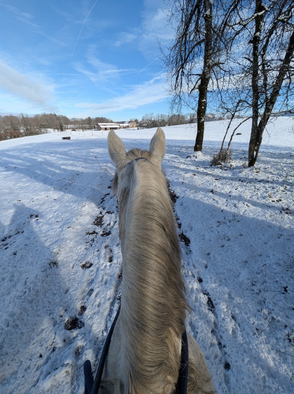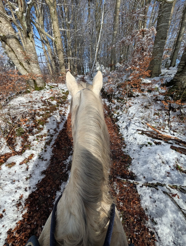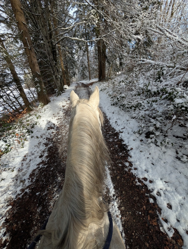 Du coup reste de la balade on a fait du pas et pas mal de trot ça nous a bien réchauffés ! Le tout en extension pour bosser ce petit dos ! Il a été top ! Bon a des moments il prenait le galop au lieu du trot mais à des moments il m'a sorti un trot de fou