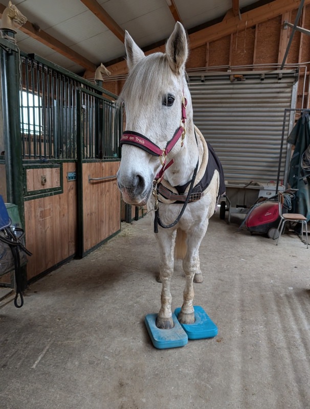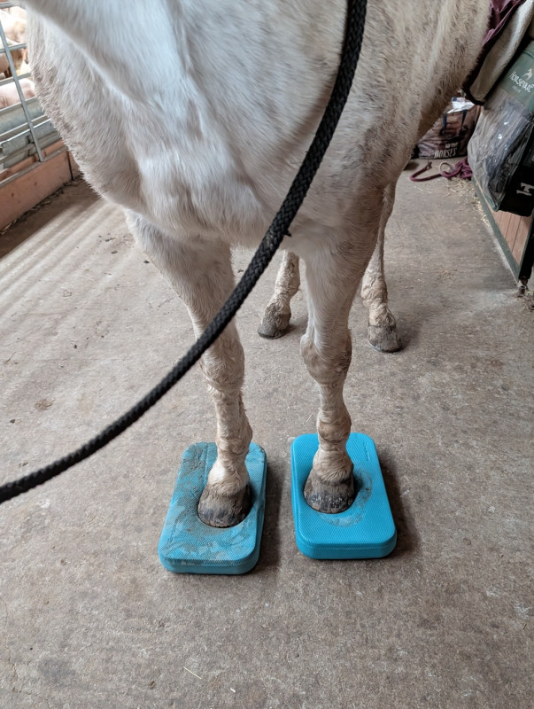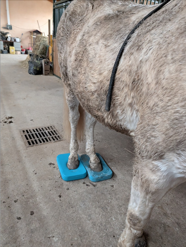 Retour aux écuries travail sur les pads, et là je peux le dire au pluriel car j'en ai acheté un 2ème ! On a commencé par un seul à la fois comme d'habitude, puis comme les postérieurs sont super faciles on a commencé par tester 2 sous les postérieurs, donc un sous chaque pied et top il y est resté un bon moment ! Les antérieurs surtout le gauche étant plus difficiles j'ai hésité à tenter mais j'ai testé quand même et il y est resté un petit moment aussi, bravo mon ptit chat
