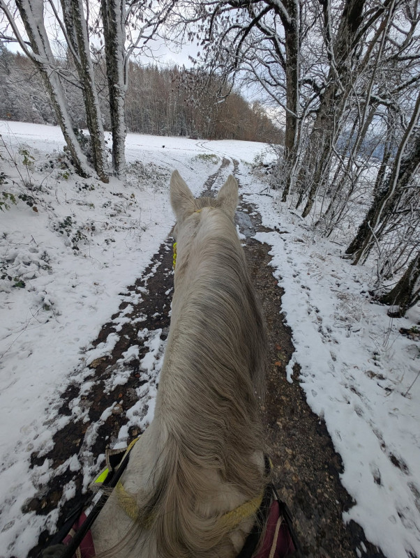 On a fait juste un mini tour de 40 minutes et 3,7km, quasiment que du pas mais on s'est tous les deux fait le kiff de 2-3 petits galop dans la neige