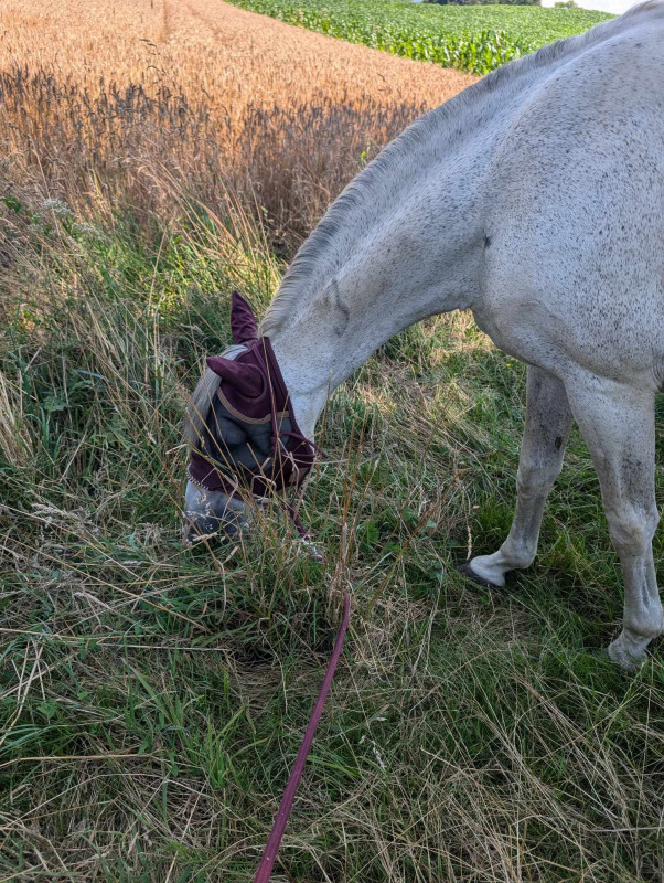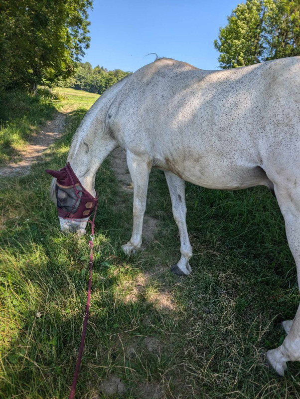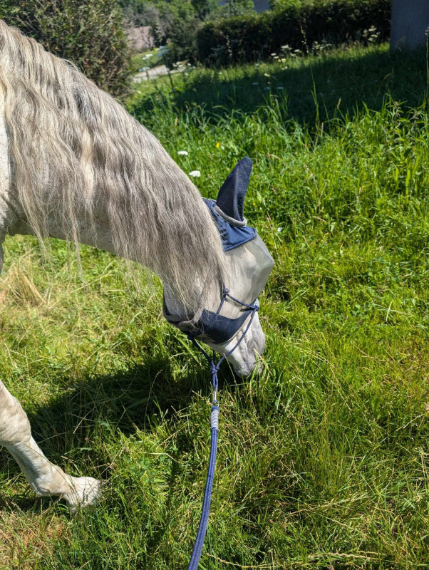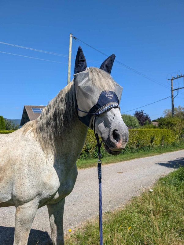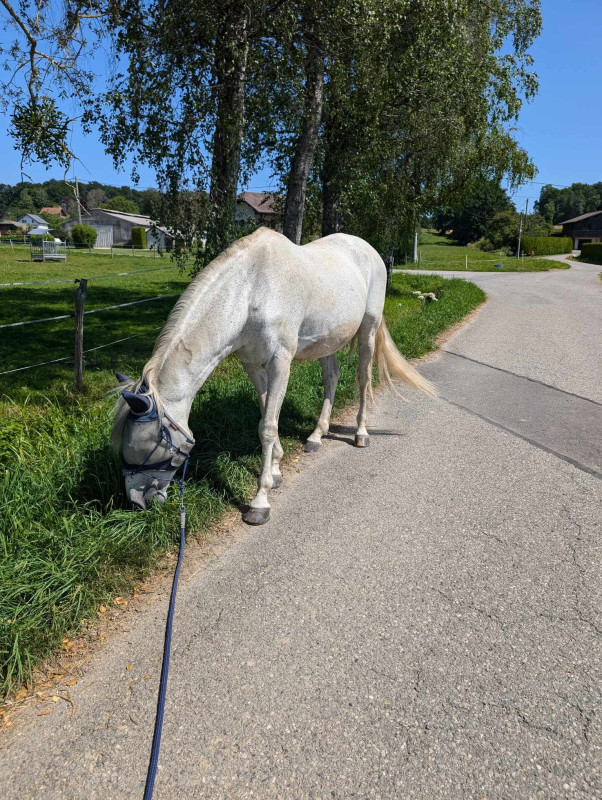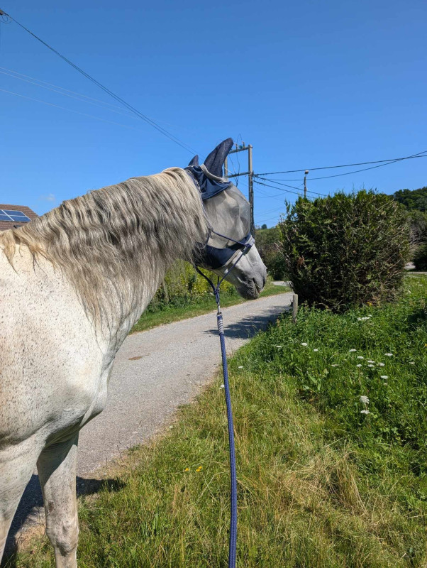 Bref le programme a été le même que depuis une semaine, je l'ai récupéré au pré, passage aux écuries puis on est partis faire notre petite heure de brouting ... Il a toujours bon appétit, marche volontiers et même si on sent qu'il est encore fatigué et le faciès pas toujours top il retrouve par moment son petit œil vif (voire coquin)