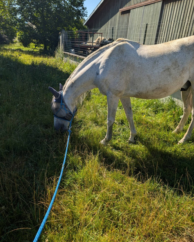 Aujourd'hui j'ai lâché le super poney en carrière... Il est parti comme un malade bon comme d'hab ça a duré juste une longueur mais c'est qu'il reprend vraiment la forme (enfin j'espère ) puis il s'est roulé et on a fait 5 min de TAP au pas (mener et cercles) puis direction brouting qui a vite cause de pluie (absolument pas prévue...)