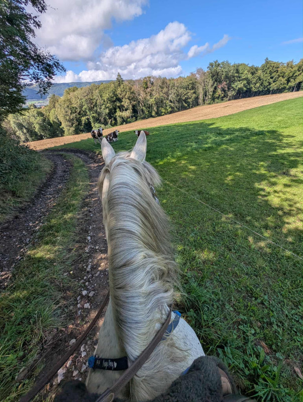 Tout le retour il était pas serein, faisait régulièrement demi tour pour regarder, s'arrêtait de brouter pour regarder, bref tendu comme pas possible le poney !