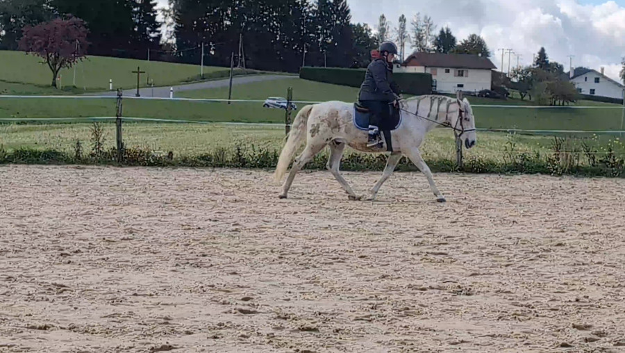 On débute la séance par détente en longe en licol, aux 3 allures des lignes droites, grands cercles et transitions, poney très mignon et qui se déplace plutôt bien, 10 minutes d'échauffement, nickel !