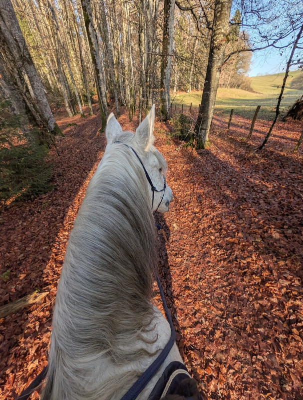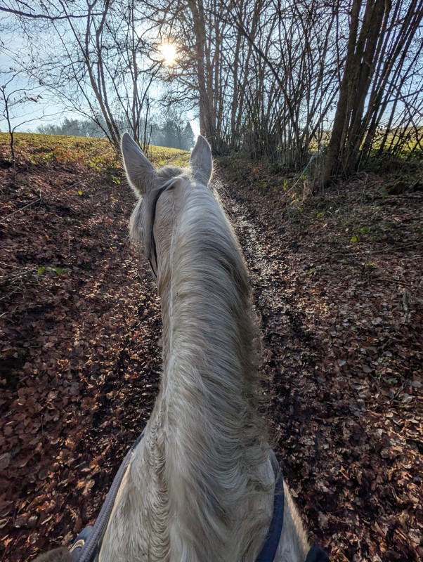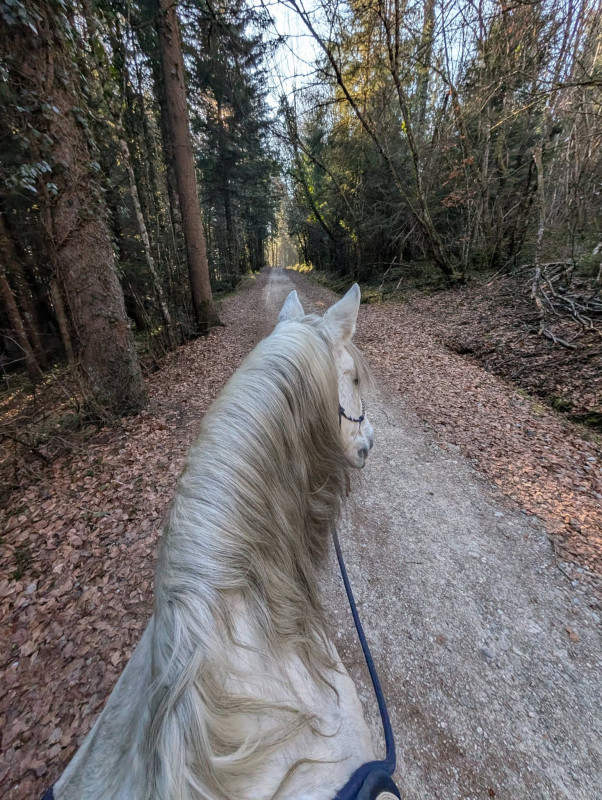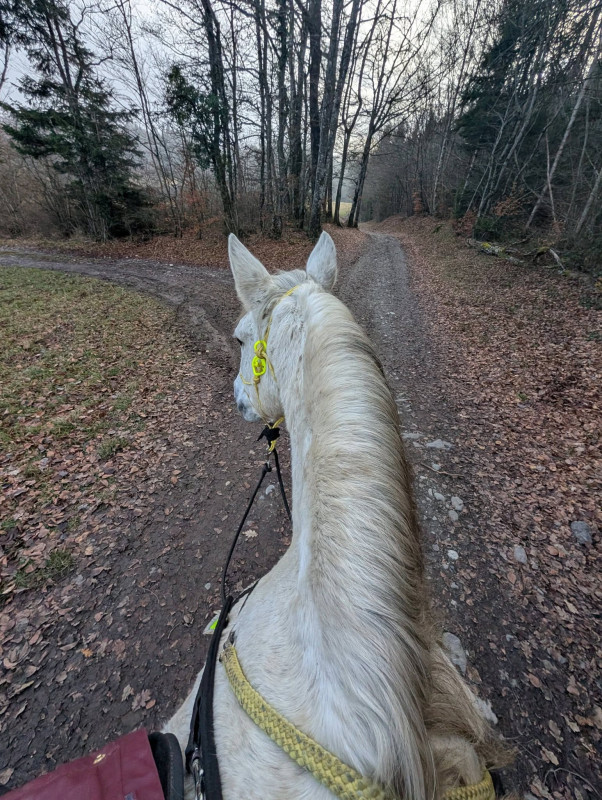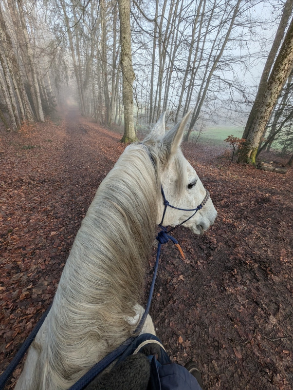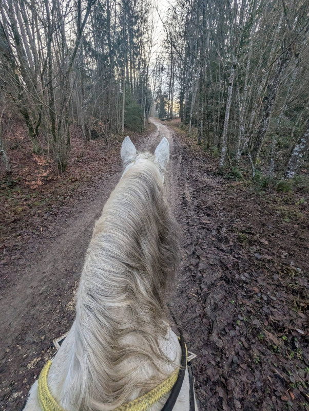 On a fait que du pas sauf le grand galop dans le chemin qui remonte et un peu de trot sur le retour, le tout en cordelette, parfait poney (bon au grand galop j'ai réussi a l'arrêter au bout du chemin mais clairement quand il était à fond je pouvais pas haha mais par contre au trot, transition au pas sans les mains )