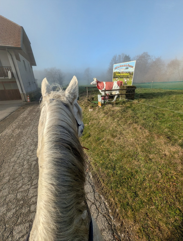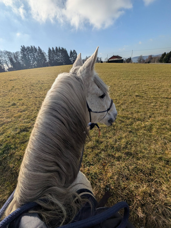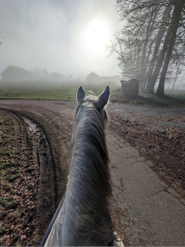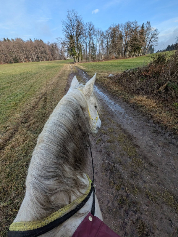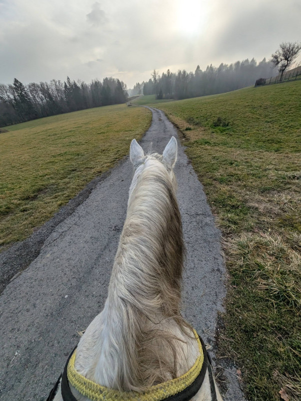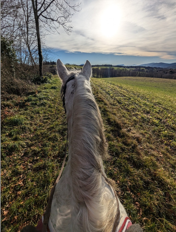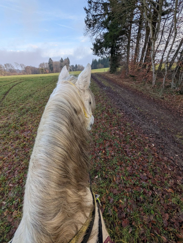 On a fait que du pas sauf le grand galop dans le chemin qui remonte et un peu de trot sur le retour, le tout en cordelette, parfait poney (bon au grand galop j'ai réussi a l'arrêter au bout du chemin mais clairement quand il était à fond je pouvais pas haha mais par contre au trot, transition au pas sans les mains )