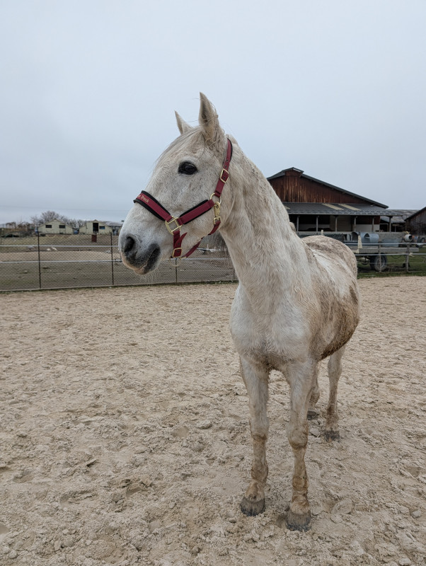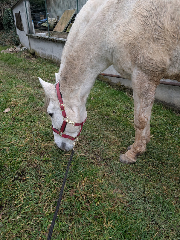 En mars de l'année dernière je trouve une nouvelle DP, une jument trotteuse de euh on m'avait dit 14 ans mais à priori plutôt 17 d'après mes recherches, qui a été réformée, n'a pas couru mais a fait les entrainements, puis a fait 6 poulains puis remise en pré et jamais vraiment bossée.