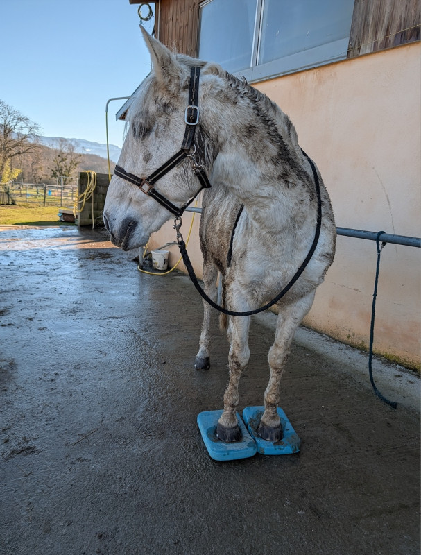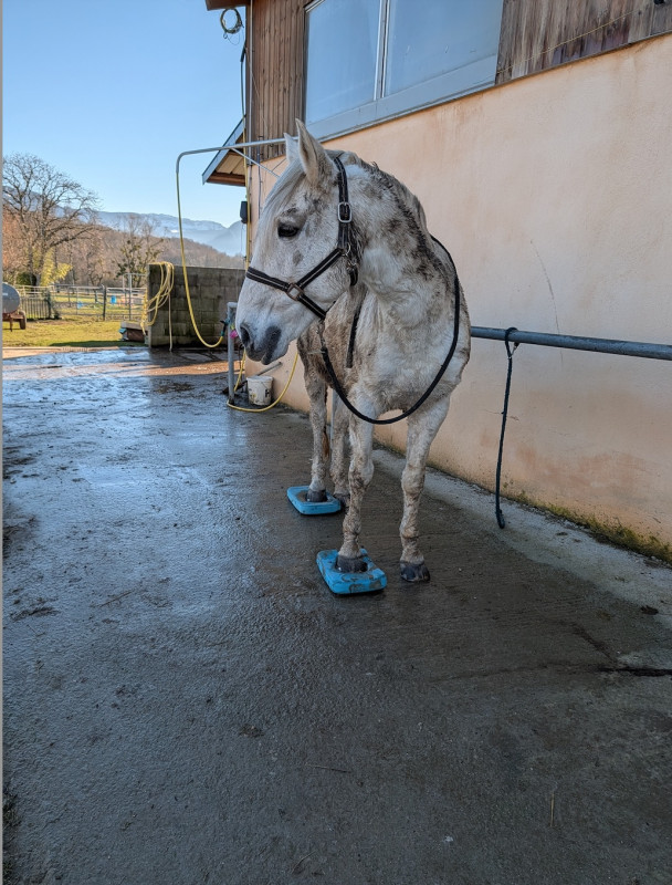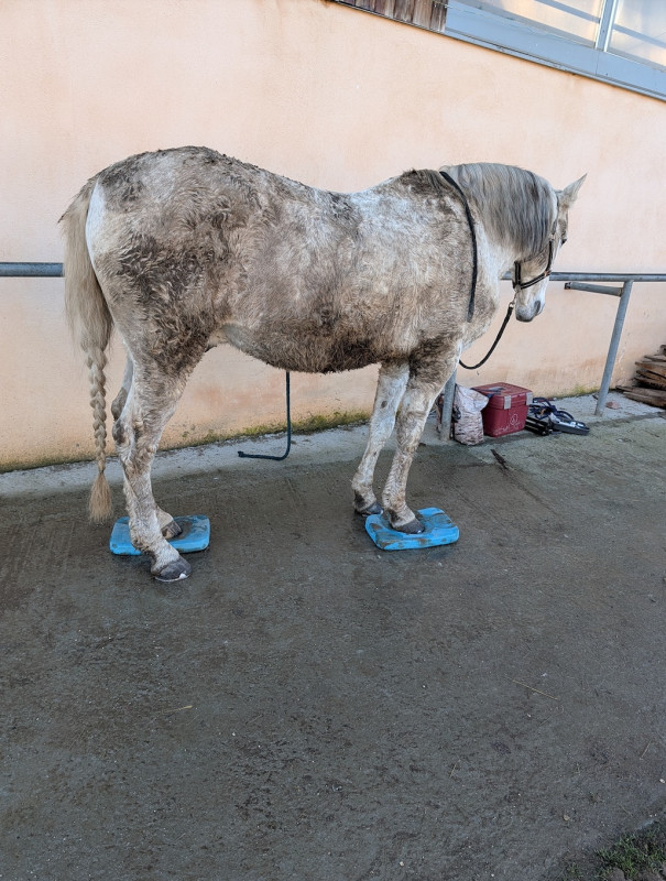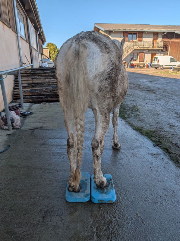 Puis retour aux écuries travail sur les pads, maintenant par 2 c'est devenu une formalité, même sur les antérieurs il bouge plus du tout et reste tranquillement dessus même si je m'éloigne