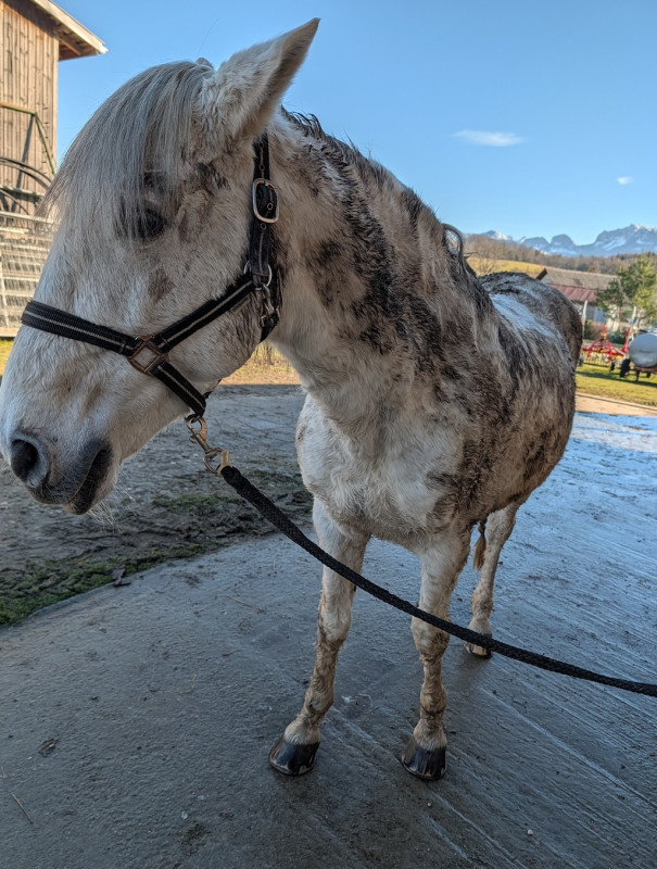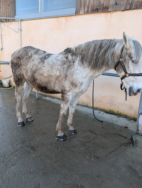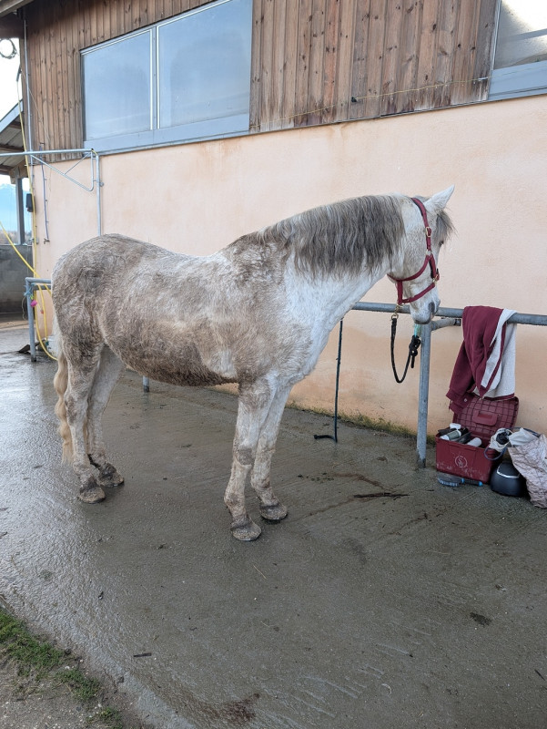 Bon, déjà, je passe devant son pré pour arriver aux écuries, je le vois qui gratte pour se rouler, j'ouvre la fenêtre, je l'appelle et lui demande de pas se rouler, bon ben échec le temps que j'aille me garer et le chercher il s'était roulé et avec la boue bien humide humm l'état du poney