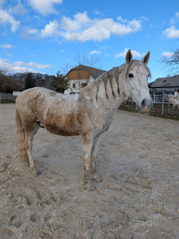 En mars de l'année dernière je trouve une nouvelle DP, une jument trotteuse de euh on m'avait dit 14 ans mais à priori plutôt 17 d'après mes recherches, qui a été réformée, n'a pas couru mais a fait les entrainements, puis a fait 6 poulains puis remise en pré et jamais vraiment bossée.