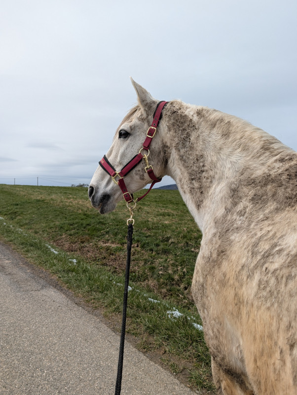 En mars de l'année dernière je trouve une nouvelle DP, une jument trotteuse de euh on m'avait dit 14 ans mais à priori plutôt 17 d'après mes recherches, qui a été réformée, n'a pas couru mais a fait les entrainements, puis a fait 6 poulains puis remise en pré et jamais vraiment bossée.