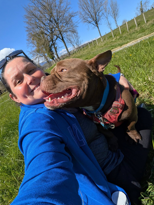 Ensuite chouchou Brutus en binôme avec sa coloc de box Monika et une autre bénévole ! On a fait une pause assis dans un champ au soleil câlins et gratouilles il était trop content p'tit cœur