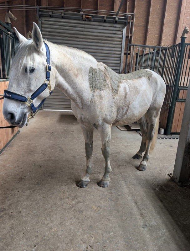 Retour aux écuries, il avait bien transpiré avec son poil d'ours donc je lui ai mis la couverture céramique un moment en récup + séchage et ensuite cataplasme d'argile sur le dos et les articulations des membres