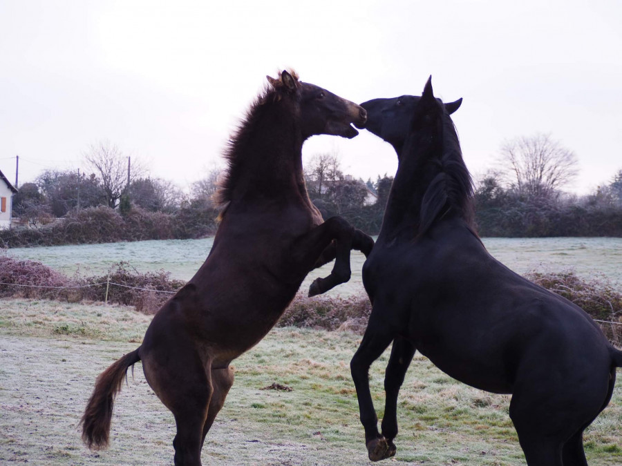 Sachez que c'est une pouliche avec laquelle je souhaiterais faire des concours plutôt de dressage, mais maman à pu aussi apporter son super coup de saut bien qu'elle est des origines plutôt orienté dressage. N'hésitez pas à me dire ce que vous en pensez, le positif, le négatif et si vous aussi vous auriez tenté ce type de croisement et pourquoi (ou bien un autre dans le même style). Pour ma part, je souhaitais améliorer le galop de ma jument, apporter un peu plus d'allure aérienne en sachant que ma jument à beaucoup d'amplitude (merci au trotteur qui traine quelque part dans ses origines et qui apporte beaucoup de puissance aussi à l'arrière main). Bref pour moi, Baccara corrigé "les défauts" de Brujo (bien que je ne lui en voie pas, tellement il est charismatique) et Brujo ceux de Baccara.