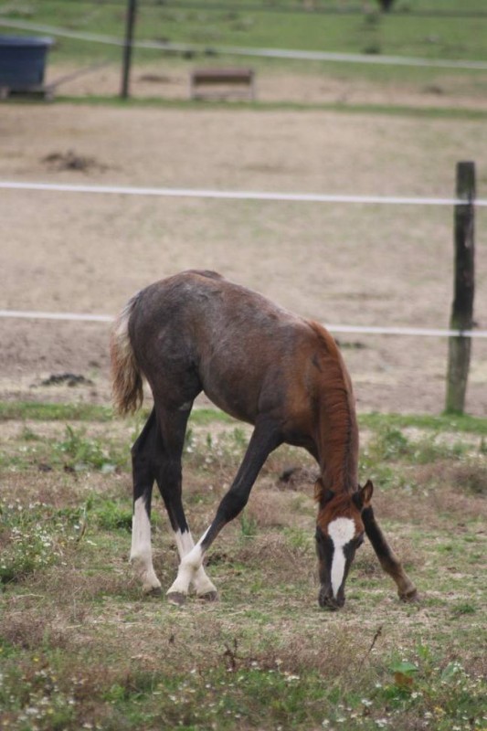 On voit clairement que ce poulain est rouan et non gris. C'est un SFO, fils de Quick Star et d'une mère par Benroy, PS. Enfin, pas officiellement SFO parce que sa courte souche, une de celles développées par les Chambry dans le Bessin (affixe d'Aure, naisseurs de Timon d'Aure) "
