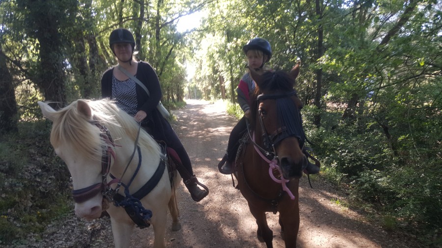 Maintenant qu'ils sont plus grands (ils se tiennent), je prend soit le papy en longe en dextre, il est gentil c'est une assurance vie. soit je pars a pied en tenant un cheval dans chaque main (et les parents qui suivent, eux ils rattrapent les enfants, moi je gère les chevaux