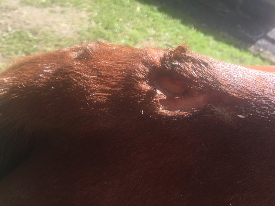 Par contre, il s'est blessé partout le nuit dernière et a une plaie profonde à la base de la queue. Avec le temps toute les mouches se posait dessus malgrès qu'elle soit sèche ; mais pour ne pas avoir de soucis, j'ai désinfecté et appliqué de l'alu sur toutes ses plaies. Il manquerait plus que ça s'infecte !