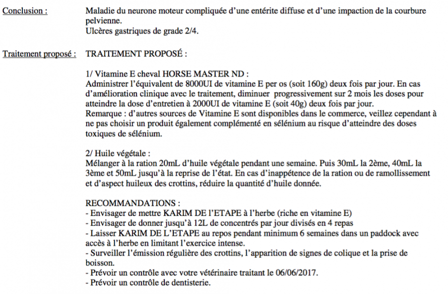 La cure de vitamines E continu, pareil avec l'huile. On a décider de réduire l'huile car ses crottins deviennent trop mou ; la vétérinaire passe mercredi matin faire une prise de sang pour vérifier le taux de vitamine E (qu'il ne soit pas sur-vitaminé ou sous-vitaminé) et pour suivre un peu son état.