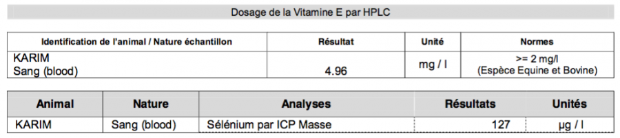 J'ai reçu les résultats de prise de sang de Karim, tout est OK , Vitamine E et sélénium à la norme, ça fait plaisir.