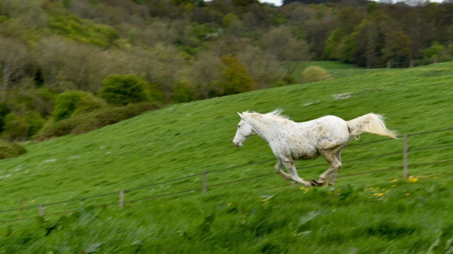 Nous avons une pension 100% pré. L'hiver les chevaux sont en grands paddocks avec abri, ils y vont pour manger ou par grand vent, mais la pluie ou le froid ne les dérange pas (ce sont des projections humaines :) )Et au printemps, ils sont dans de grands prés en troupeau. Je vous mets quelques photos de la mise à l'herbe pour que vous voyez le plaisir qu'ils ont !
