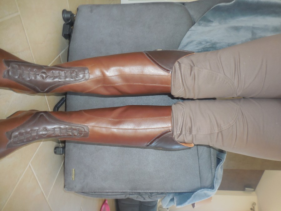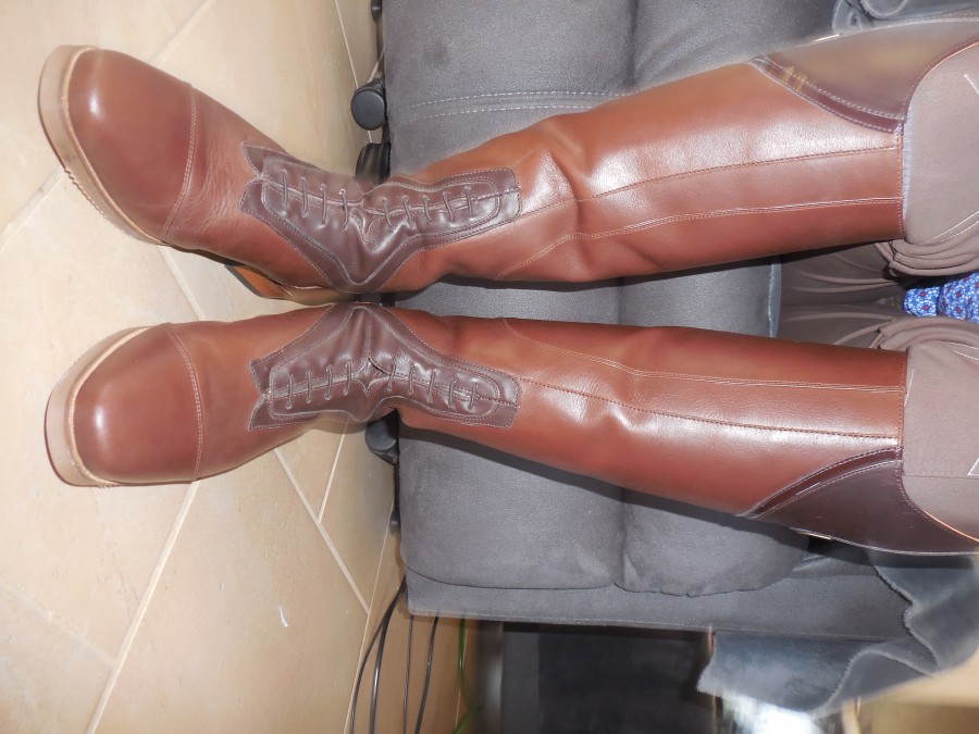 Le haut de la botte côté extérieur de la jambe n'est pas parfaitement collé à mon genou, ce qui constitue ma seconde inquiétude... D'une, j'ai peur d'avoir l'air débile si je les porte, et de deux, ça semble être le signe annonciateur que la taille est trop grande.
