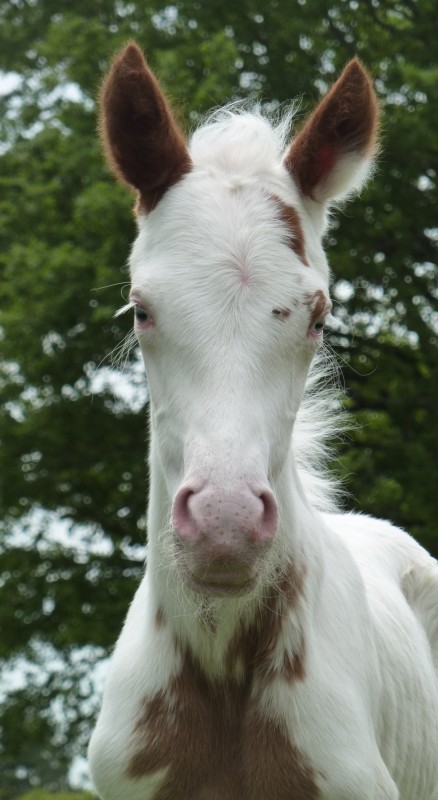 Par contre, j'ai une pouliche pie alezan, première fille de mon étalon, que je garde, qui est "medicine hat" : elle a la tête blanche, aux yeux bleus, avec les deux oreilles colorées. Toutefois, on a l'impression que la couleur de l'oreille gauche a dégouliné de la base sur la tête.