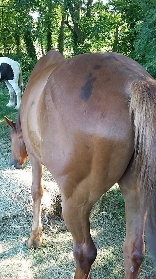 J'aimerais partager une chose assez "curieuse", enfin personnellement je ne l'avais jamais vu, Voilà mon petit cheval, palomino croisée QHxLusitanien et des tâches sur les fesses qui s’étendent petit à petit