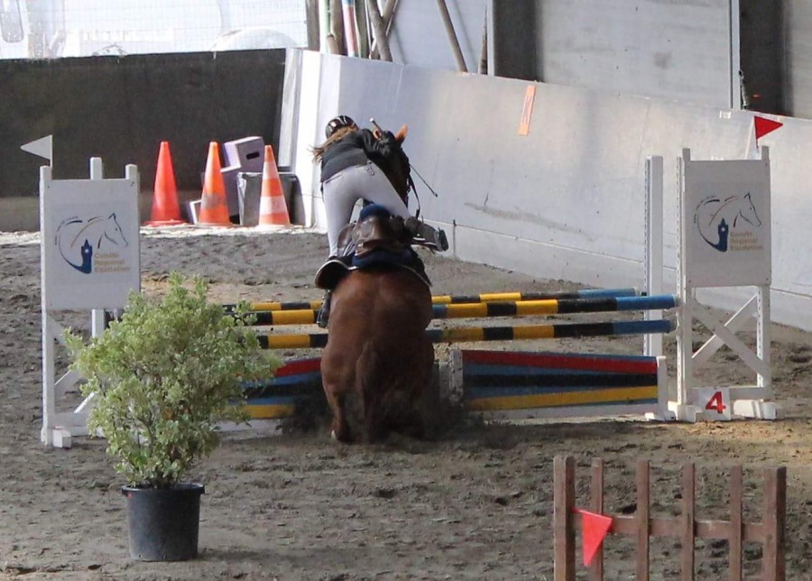 on retravaille plat énormément. Après 1 mois, on reprend l'obstacle et elle ne regarde vraiment rien !! Passe tout !! On part au concours et détente niquel (P2) j'arrive sur le.tour je lui montre le 2 qui est une grande palanque blanche elle ne regarde même pas et le 4 qui est un oxer avec sous bassement (PHOTO). On commence le parcours 1 oxer montant sans sous bassement, 2 elle regarde à la dernière foulé mais la jambe et sa passe, 3 un saut de biche , il n'y avait que deux plots en dessous et le 4 un stop à la dernière foulé où elle est limite assise. Je reviens et elle le passe tranquille sans marge ! et 5 refus un obstacle tout simple couleur bois en descendant... puis elle passe le 6 c'était le même car ligne et 7 un simple oxer blanc et noir elle m'ejecte carrément, mais vraiment méchant. Je remonte puisqu'ils me laisse ressauter un obstacle. Je ressaute le 7 et niquel... À cet instant on ne comprend vraiment pas... Je lui montre aucune réaction et en allant dessus stop à la dernière foulé. On fait très attention à avoir le bon galop ainsi que pas trop de main mais des jambes et encadrer.